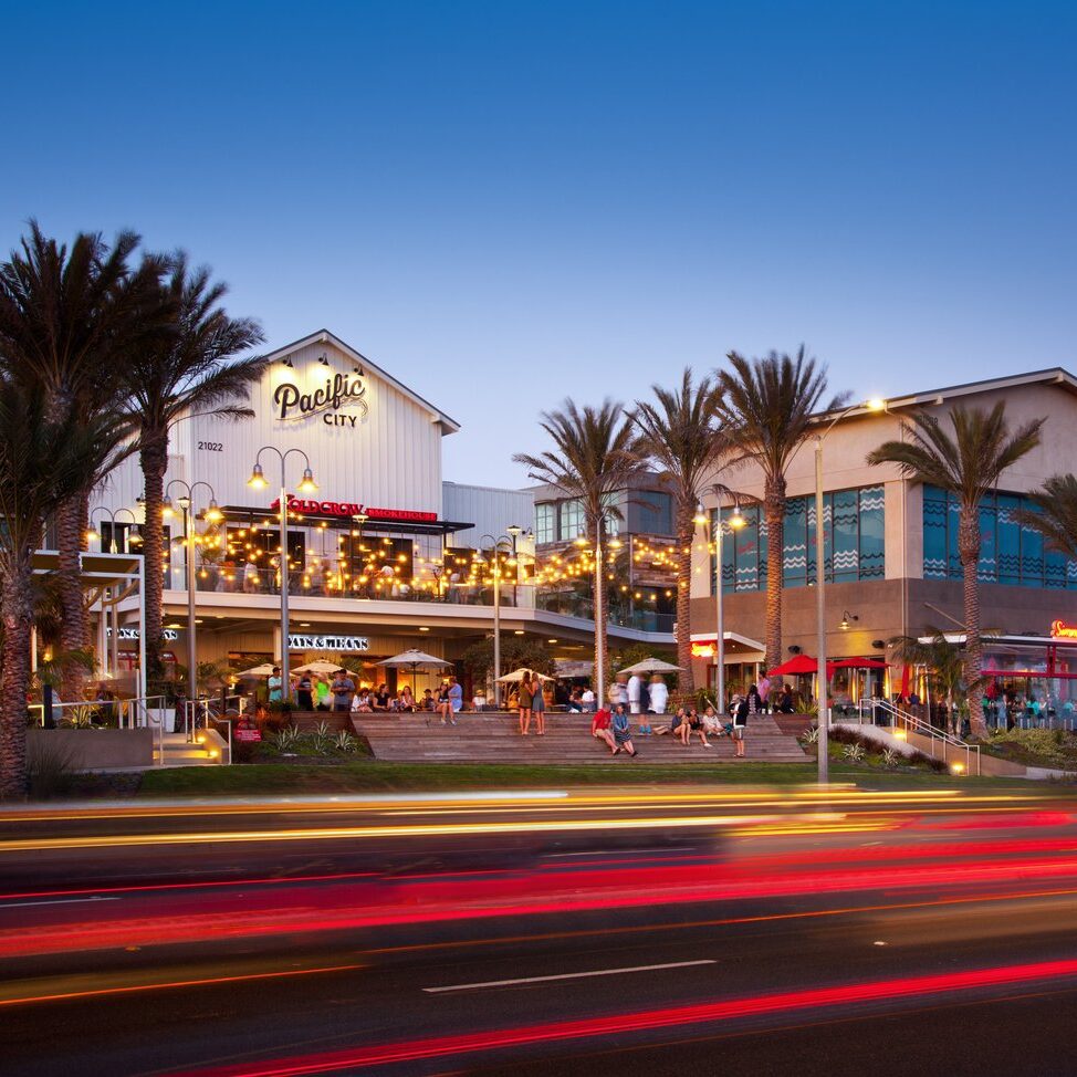 A modern oceanfront shopping and dining destination overlooking the Huntington Beach Pier, blending retail, restaurants, and coastal views.